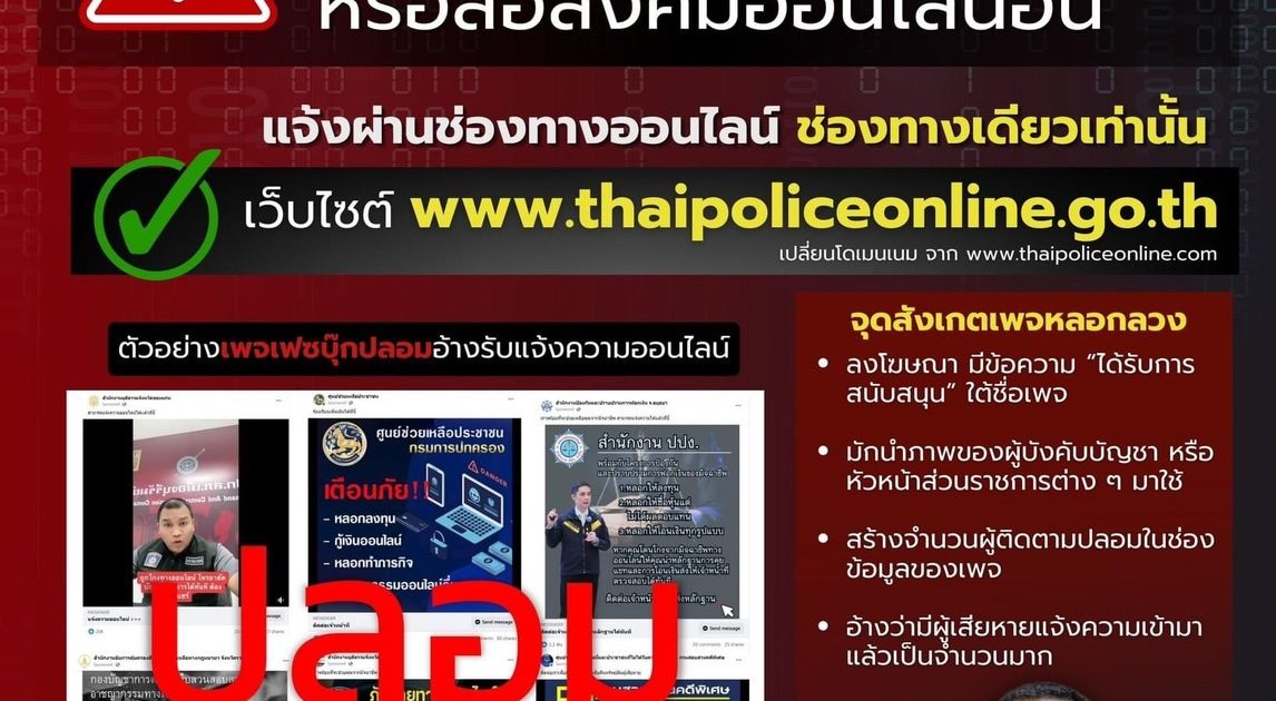 พล.ต.ต.ศิริวัฒน์ ดีพอ รองโฆษกสำนักงานตำรวจแห่งชาติ กล่าวว่า พล.ต.อ.ต่อศักดิ์ สุขวิมล ผบ.ตร. ได้มีความห่วงใยพี่น้องประชาชนที่อาจได้รับความเสียหายจากอาชญากรรมรูปแบบต่าง ๆ ซึ่งในปัจจุบันได้มีกลุ่มมิจฉาชีพที่อาศัยการสร้างเพจเฟซบุ๊กปลอมพร้อมมีการลงโฆษณา อ้างเป็น สำนักงานตำรวจแห่งชาติ หรือหน่วยงานราชการอื่น ระบุข้อความว่าสามารถแจ้งความออนไลน์ได้ที่บัญชีสื่อสังคมออนไลน์ดังกล่าว ซึ่งไม่เป็นความจริง และมีการหลอกลวงเอาทรัพย์สินโดยการอ้างว่าเป็นค่าดำเนินการ ค่าเร่งรัดคดีเป็นกรณีพิเศษ หรือเป็นวิธีการที่จะทำให้ได้เงินคืนจากคนร้าย โดยหลอกให้เข้าลงทุนในเว็บไซต์หลอกลงทุนหรือหลอกให้เข้าเล่นเว็บไซต์พนันออนไลน์ ทำให้มีพี่น้องประชาชนหลงเชื่อได้รับความเสียหายเป็นจำนวนมาก