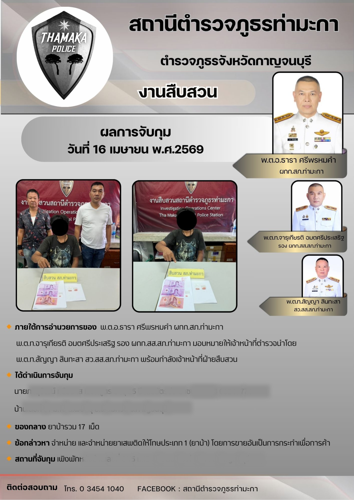 รายงานผลปฏิบัติการจับกุมยาเสพติด พร้อมของกลาง ยาบ้า 17 เม็ด 🔸 ข้อหา จำหน่ายยาเสพติดให้โทษประเภท 1 (ยาบ้า) และจำหน่ายยาเสพติดให้โทษประเภท 1 (ยาบ้า) โดยการขายอันเป็นการกระทำเพื่อการค้า