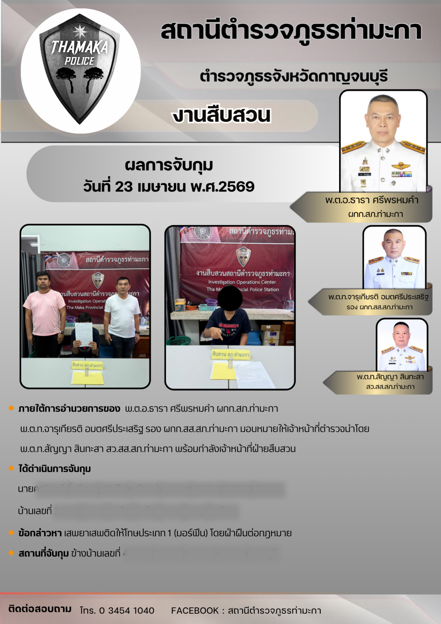 รายงานผลปฏิบัติการจับกุมการพนัน วันที่ 23 เม.ย.69 เวลาประมาณ 14.30 น. 🔸 ข้อหา เสพยาเสพติดให้โทษประเภท 1 (มอร์ฟีน) โดยฝ่าฝืนต่อกฎหมาย