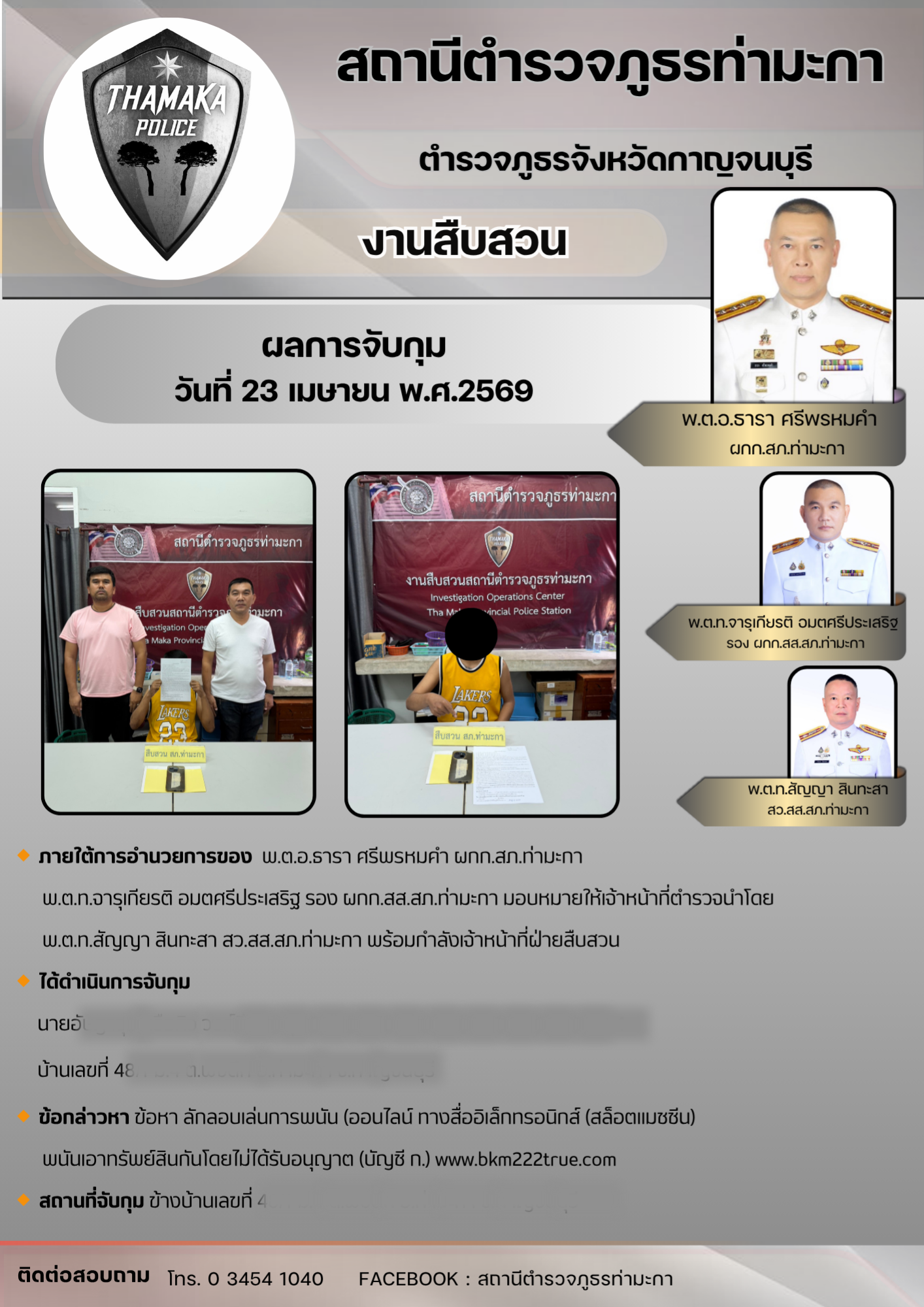 รายงานผลปฏิบัติการจับกุมการพนัน วันที่ 23 เม.ย.69 เวลาประมาณ 14.00น. 🔸 ข้อหา ลักลอบเล่นการพนัน (ออนไลน์ ทางสื่ออิเล็กทรอนิกส์ (สล็อตแมชชีน) พนันเอาทรัพย์สินกันโดยไม่ได้รับอนุญาต (บัญชี ก.)