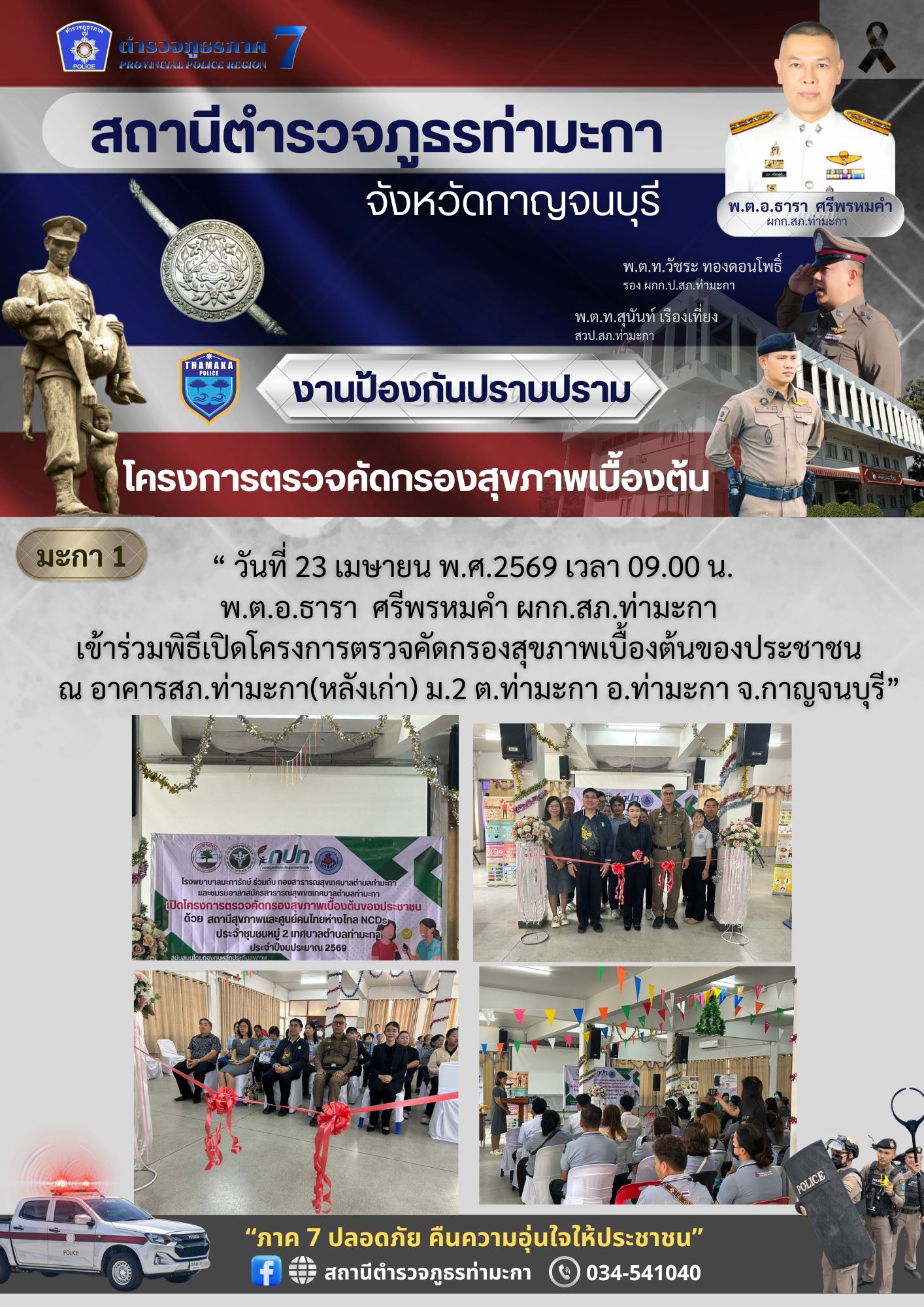 พ.ต.อ.ธารา ศรีพรหมคำ ผกก.สภ.ท่ามะกา ด้ร่วมกันทำพิธีเปิดโครงการตรวจคัดกรองสุขภาพเบื้องต้นของประชาชน เพื่อคัดกรองสุขภาพความดันโลหิตและเบาหวาน ทุกวันพุธ ตั้งแต่เวลา 09.00 น.-11.00 น.