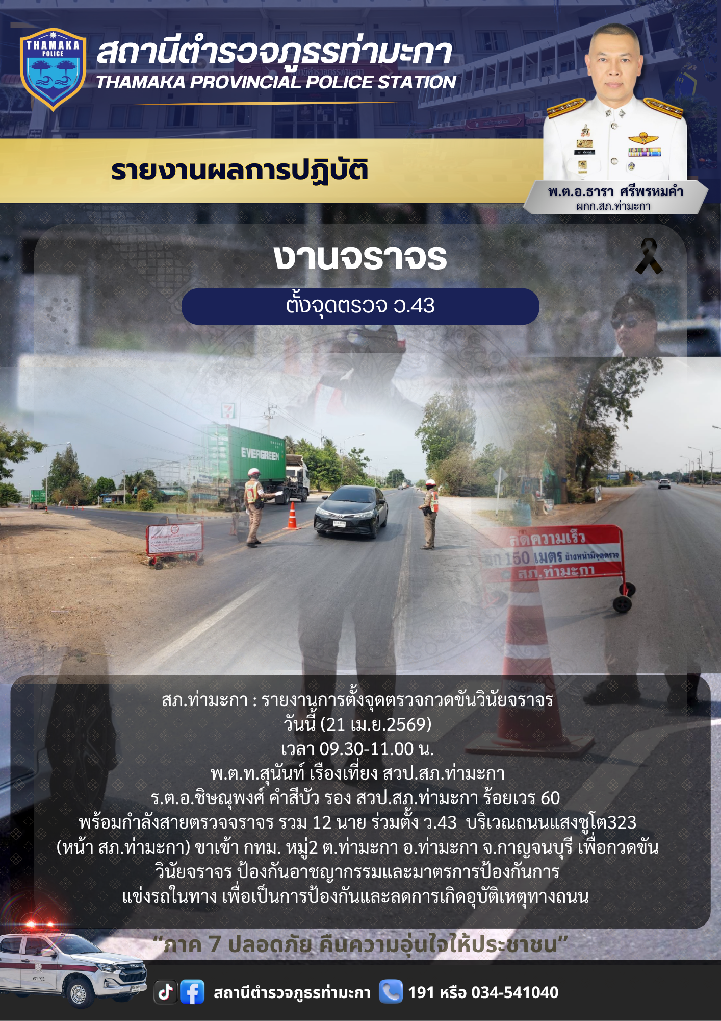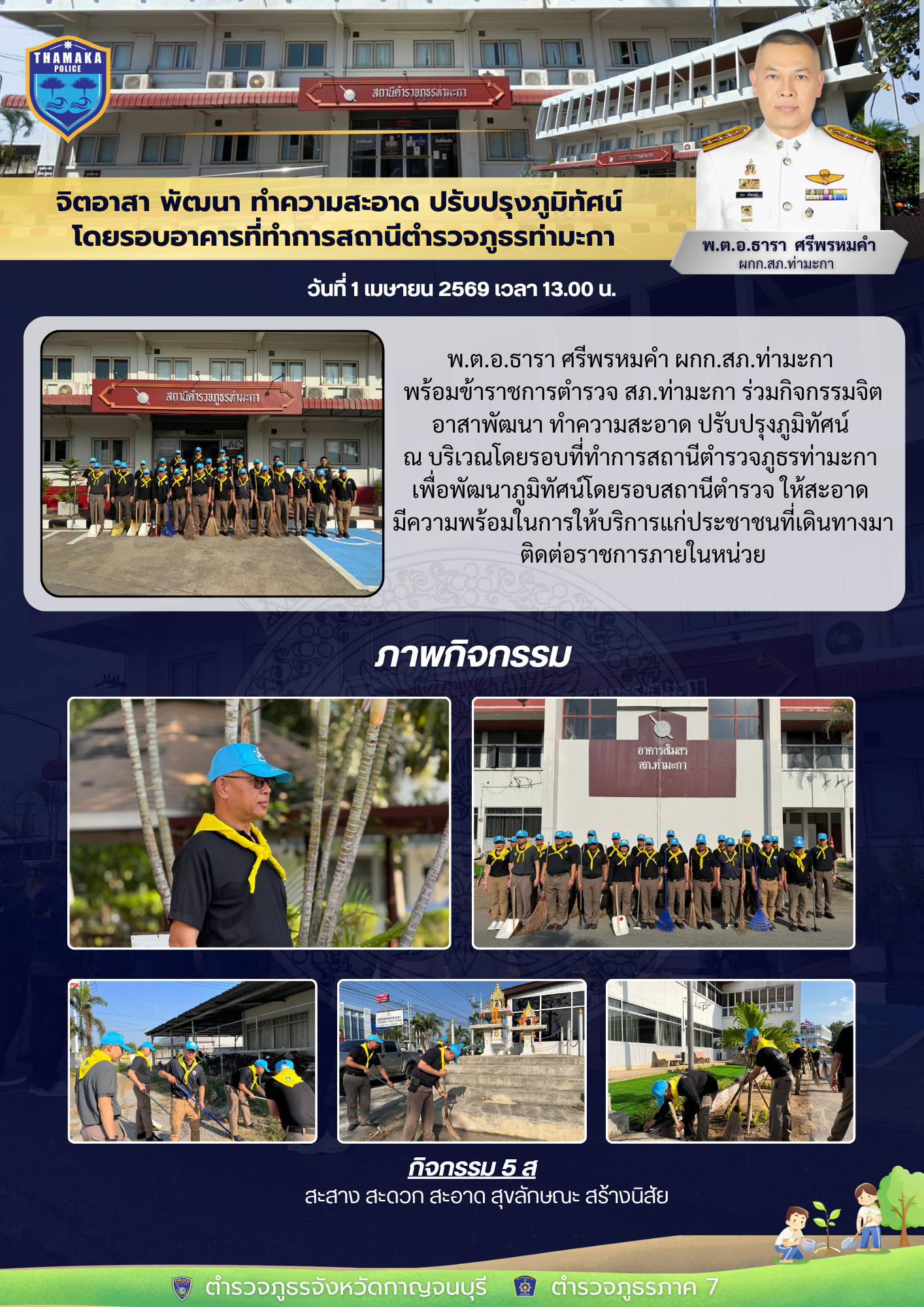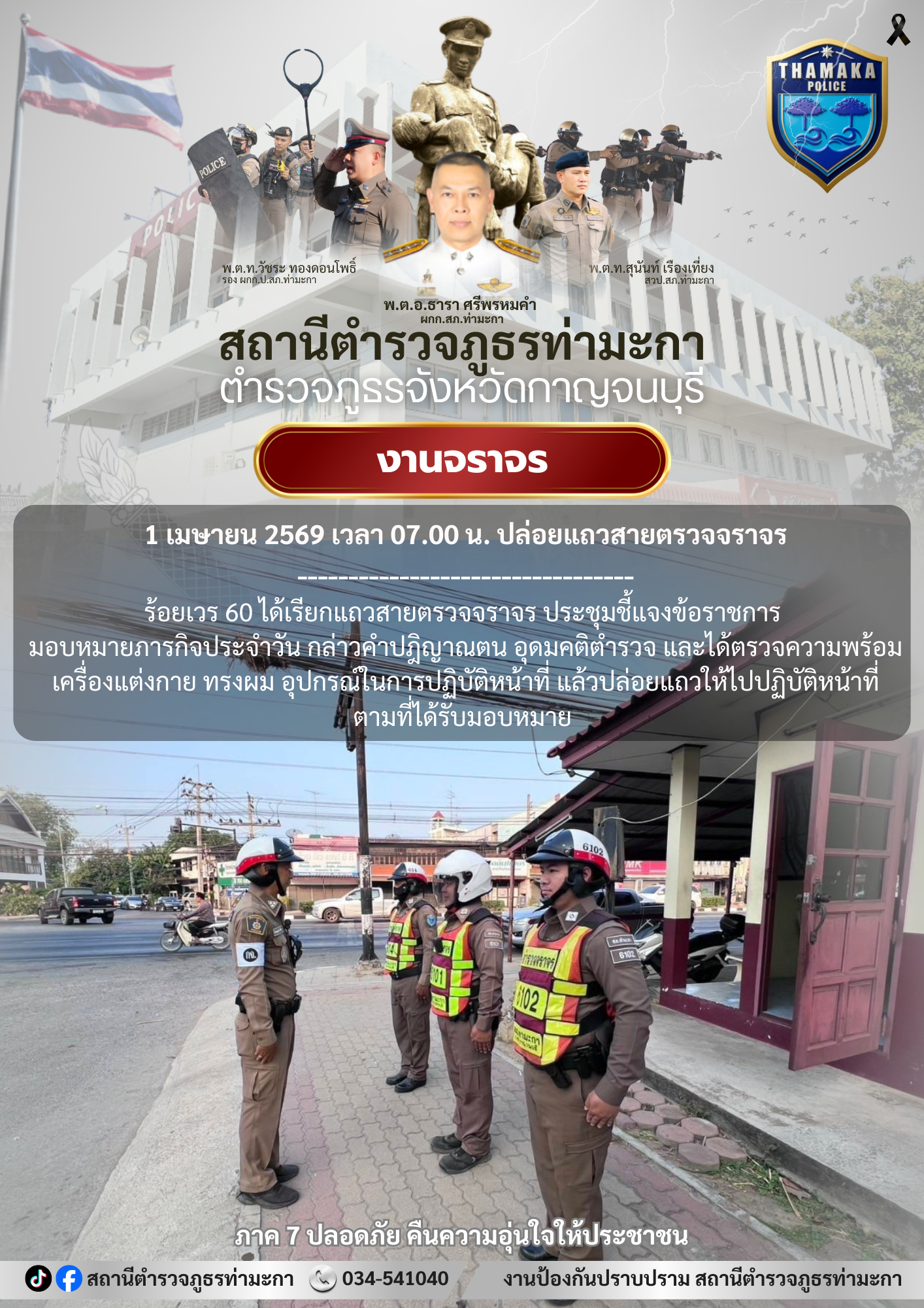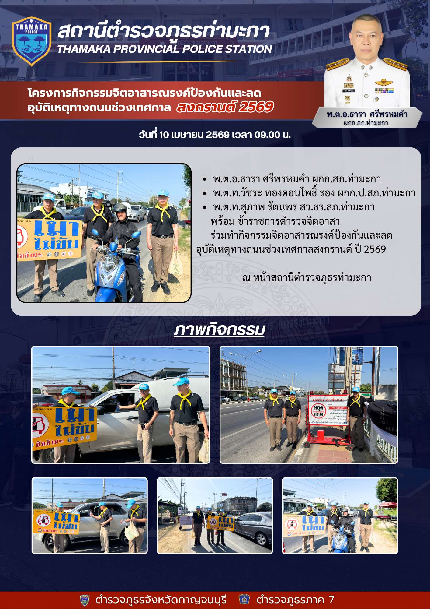 พ.ต.อ.ธารา ศรีพรหมคำ ผกก.สภ.ท่ามะกา พร้อมด้วย พ.ต.ท.สุภาพ รัตนพร สว.ธร.สภ.ท่ามะกา และ เจ้าหน้าที่ตำรวจชุดจิตอาสา สภ.ท่ามะกา ร่วมทำกิจกรรจิตอาสา “รณรงค์ป้องกันและลดอุบัติเหตุทางถนนช่วงเทศกาล สงกรานต์ 2569”