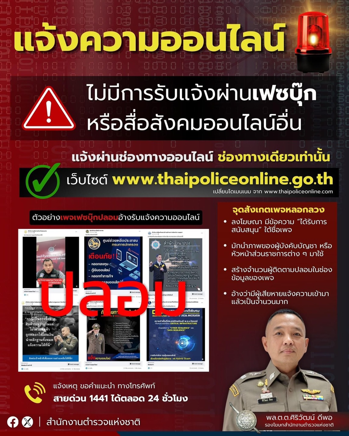 ตร. เตือน แจ้งความออนไลน์มีที่เดียวคือ www.thaipoliceonline.go.th เท่านั้น ไม่มีรับแจ้งผ่านเฟซบุ๊ก พ